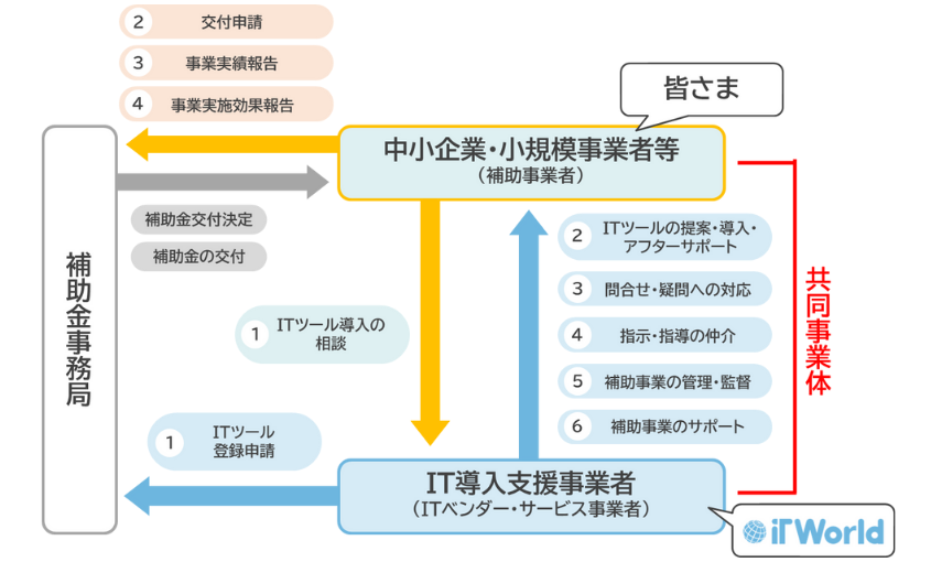 皆さまこんにちは。弊社はバックオフィス業務の効率化・改善を目的に、システムの選定から導入、運用定着までを一貫して支援を行っているIT導入支援事業者の株式会社IT Worldです。弊社ではこれまで、業種・規模を問わず多くの企業様の業務改善に携わってまいりました。 さて、毎年多くのお問い合わせをいただいている「IT導入補助金」について、2026年度(令和8年度)の最新情報が公開されました。これまで中小企業の生産性向上を支援してきたIT導入補助金は、2026年度(令和8年度)より「デジタル化・AI導入補助金」へと名称が変更されています。 「名称が変わったことで、制度内容はどう変わるのか」「補助金対象ツールはAI搭載機能でないといけないのか」こうした疑問をお持ちの事業者様に向けて、最新の公募要領をもとに、変更点・申請要件・スケジュールを分かりやすくまとめました。 IT Worldでの補助金申請ご支援内容 複数のシステムでの申請が可能 複数のソフトウェア製品やハードウェア製品を 組み合わせて申請をすることが可能です。 例:システム(ソフトウェア)+PC(ハードウェア) お客様に最適なシステムをご提案可能 勤怠管理システム・経費精算システムなど領域を問わずお客様に最適なシステムをフェアな視点で比較、提案いたします。 導入のご支援を合わせて申請可能 システム導入時の設定代行や、操作指導従業員/管理者向けのマニュアル作成などもIT導入補助金では補助対象となっております。 申請費用原則無料 ※申請内容によって、別途費用をいただく場合もございます。 詳しくはお問い合わせください。 2026年デジタル化・AI導入補助金 先行受付フォームはこちら 目次 1.デジタル化・AI導入補助金とは?(旧IT導入補助金) 2.【重要】昨年度(2025年度)からの主な変更点 3.デジタル化・AI導入補助金の5つの申請枠 4.申請対象者 5.公募スケジュール 6.申請の流れ 1. デジタル化・AI導入補助金とは?(旧IT導入補助金) 本補助金は、中小企業・小規模事業者がITツールを導入する経費の一部を補助し、業務効率化やDX化を推進するための制度です。今回の名称変更により、単なるソフト導入にとどまらず、AI(人工知能)の活用や高度なデジタル化への支援がより明確に打ち出されました。IT導入補助金の申請は、事業者さまのみで申請を行うことはできません。事業者さまと国から認定されたIT導入支援事業者と協同で申請を行います。 補助金は「申請すれば必ずもらえる」ものではありません。審査を通過し「採択」されるためには、ポイントを押さえた事業計画が必要です。IT Worldは、数多くの事業者様を支援してきた豊富な採択実績がございます。 専任の担当者が、貴社の課題に寄り添い、採択の可能性を高める事業計画の策定を丁寧にサポートいたします 2026年デジタル化・AI導入補助金 先行受付フォームはこちら 2. 【重要】昨年度(2025年度)からの主な変更点 2026年度版の大きな変更ポイントは以下の2点です。 ① ITツール検索時におけるAI機能を有するツールの絞り込み機能追加 みなさまがITツールを検索する際、検索システムにおいて、「AI機能あり」の絞り込みが可能になりました。 ※AI機能を有するツールの導入が必須要件ではございません ・ITツール検索において、AI機能を有するツールの絞り込みが可能 ・ITツール検索において、AI機能を有するツールにAIツールであることを明記 ※IT導入支援事業者により、当該ツールがAI機能を有するとして申請された場合のみ対象 これにより、自社の課題解決(予測・分析・自動生成など)に直結するAIツールを見つけやすくなりました。 AI機能を搭載していないツールでの申請も可能です。 ② 2回目以降の申請(リピーター)に係る要件追加 過去(IT導入補助金2022〜2025)に交付決定を受けた事業者が再度申請する場合、以下の「賃上げ要件」が必須となりました。 ・給与支給総額の向上 3年間の事業計画で、1人当たり給与支給総額(非常勤を含む全従業員)を 日本銀行が定める年平均「物価安定の目標+1.5%以上」向上させること。 ・従業員への表明 交付申請時点で賃上げ 計画を従業員に表明していること。 ※要件未達および効果報告未提出の場合、補助金の全額返還や一部返還を求められる場合があるため 注意が必要です。 ※本要件の適用外となる対象については交付規程をご確認ください。 「2回目申請の賃上げ計画が不安」という方もご安心ください。要件が厳しくなったリピーター様向けの事業計画策定も、これまでの豊富な採択データに基づき、無理のない範囲でしっかりと要件を満たすよう緻密にサポート。返還リスクを抑えた安全な申請を支援します。 デジタル化・AI導入補助金先行フォーム 3.デジタル化・AI導入補助金の5つの申請枠 申請枠や要件については、2025年度から概ね変更はございません。詳しくは補助金公式サイトをご確認ください。 申請枠(類型) 対象となるツール・目的 補助額 補助率 通常枠1プロセス以上 業務プロセス1~3個に対応するソフト導入(